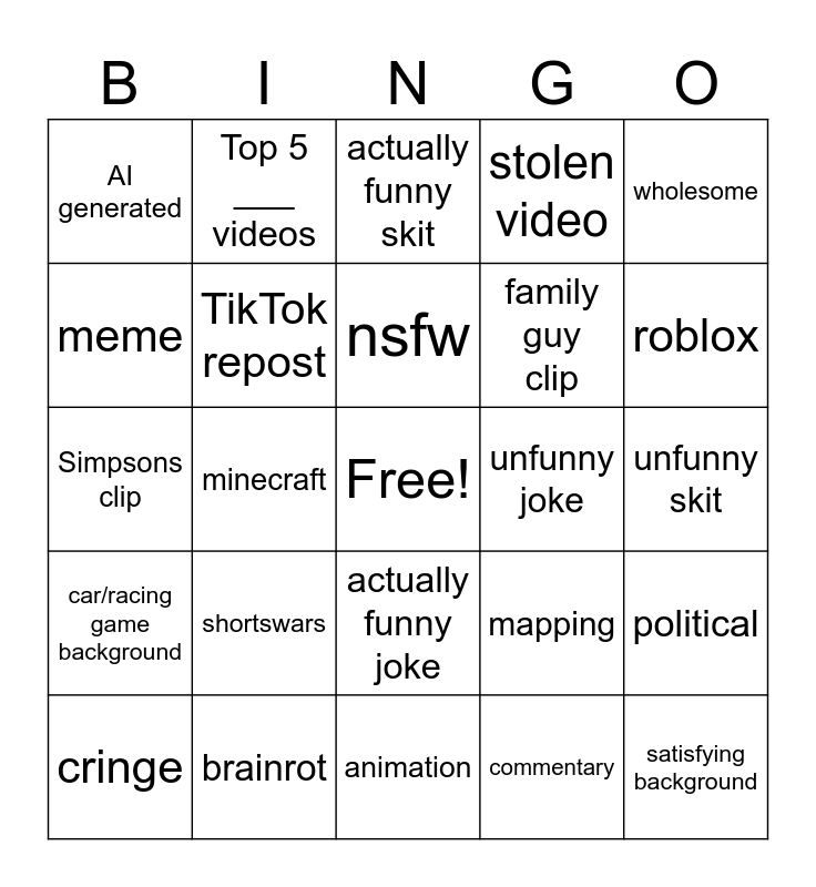 This bingo card has a free space and 24 words: shortswars, brainrot, nsfw, cringe, wholesome, AI generated, meme, Top 5 ___ videos, unfunny joke, actually funny joke, family guy clip, Simpsons clip, mapping, political, TikTok repost, commentary, unfunny skit, actually funny skit, roblox, minecraft, satisfying background, car/racing game background, stolen video and animation.