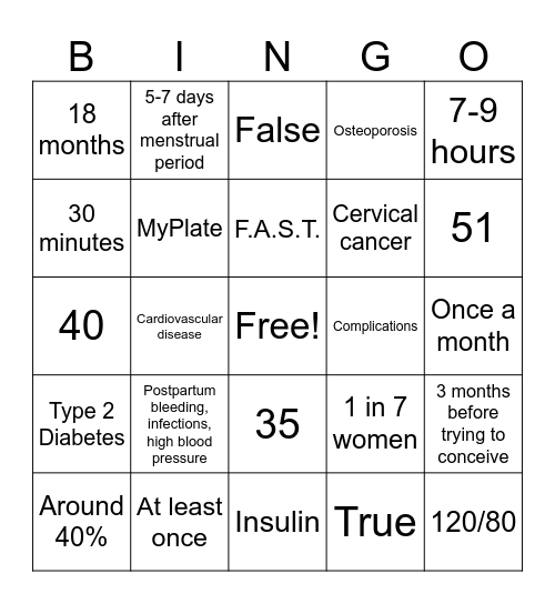 This bingo card has a free space and 24 words: Postpartum bleeding, infections, high blood pressure, At least once, F.A.S.T., Around 40%, 7-9 hours, 18 months, 30 minutes, 5-7 days after menstrual period, Complications, 35, Cervical cancer, 40, 1 in 7 women, 3 months before trying to conceive, MyPlate, True, Once a month, False, 51, Cardiovascular disease, 120/80, Type 2 Diabetes, Osteoporosis and Insulin.