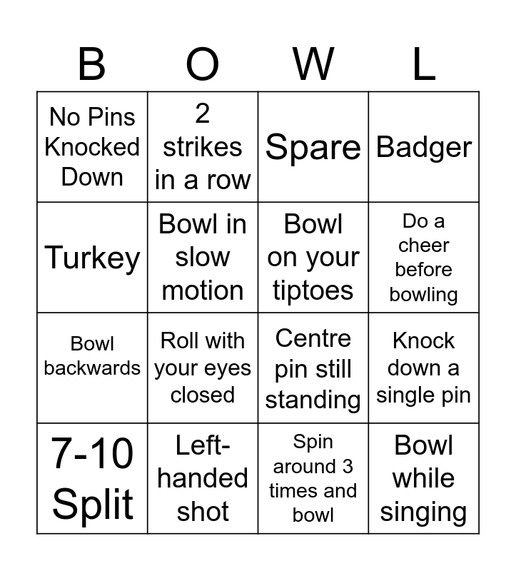 This bingo card has 20 words: Knock down a single pin, Strike, Spare, Gutter Ball, 7-10 Split, Turkey, Left-handed shot, No Pins Knocked Down, Bowl backwards, 2 strikes in a row, Roll with your eyes closed, Centre pin still standing, Bowl in slow motion, Bowl while singing, Bowl on your tiptoes, Dance up to the line, Do a cheer before bowling, Badger, Spin around 3 times and bowl and Choose a nearby bowler and bowl between their legs.