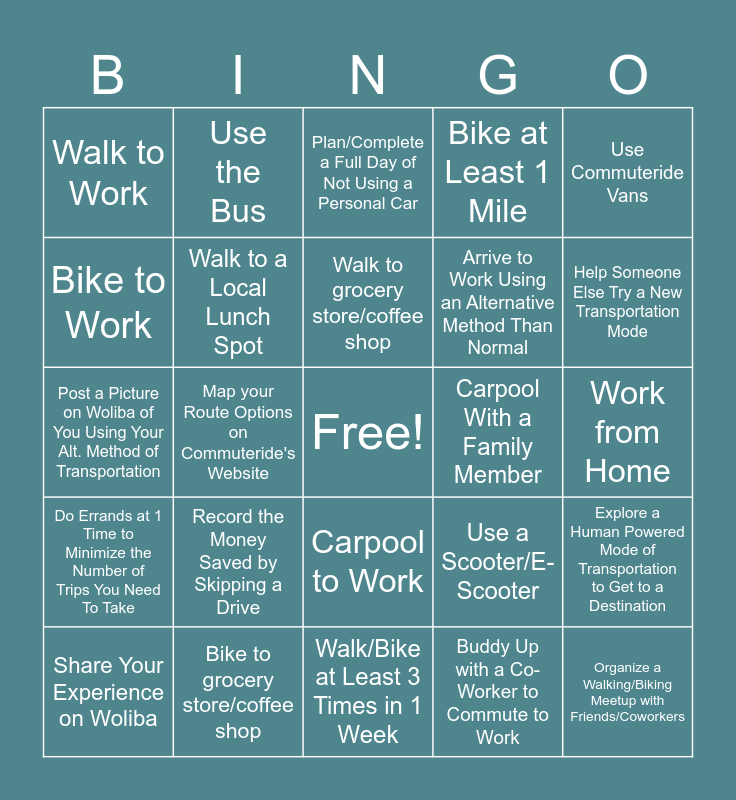 This bingo card has a free space and 26 words: Carpool to Work, Buddy Up with a Co-Worker to Commute to Work, Walk to grocery store/coffee shop, Bike to grocery store/coffee shop, Use Commuteride Vans, Walk to Work, Bike to Work, Use the Bus, Work from Home, Use a Scooter/E-Scooter, Arrive to Work Using an Alternative Method Than Normal, Post a Picture on Woliba of You Using Your Alt. Method of Transportation, Explore a Human Powered Mode of Transportation to Get to a Destination, Share Your Experience on Woliba, Map your Route Options on Commuteride's Website, Walk at Least 1 Mile, Bike at Least 1 Mile, Do Errands at 1 Time to Minimize the Number of Trips You Need To Take, Plan/Complete a Full Day of Not Using a Personal Car, Organize a Walking/Biking Meetup with Friends/Coworkers, Help Someone Else Try a New Transportation Mode, Walk/Bike at Least 3 Times in 1 Week, Carpool With a Family Member, Record the Money Saved by Skipping a Drive, Walk to a Local Lunch Spot and Choose a Commute Route Through a Park/Greenbelt.