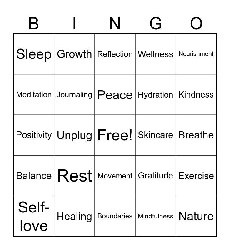 This bingo card has a free space and 25 words: Rest, Boundaries, Peace, Self-love, Nourishment, Sleep, Meditation, Growth, Skincare, Movement, Hydration, Positivity, Gratitude, Exercise, Journaling, Relaxation, Breathe, Reflection, Kindness, Unplug, Nature, Healing, Balance, Wellness and Mindfulness.