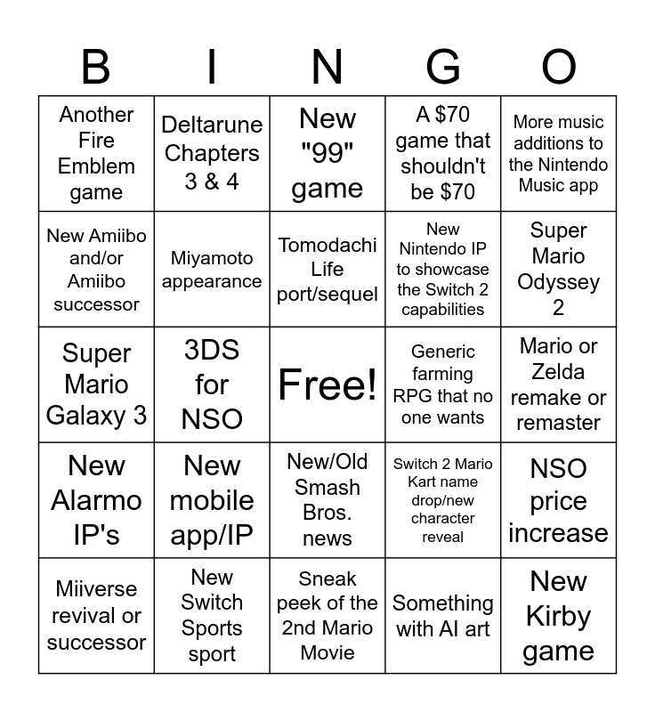 This bingo card has a free space and 24 words: New mobile app/IP, New Switch Sports sport, Tomodachi Life port/sequel, Miiverse revival or successor, More music additions to the Nintendo Music app, Another Fire Emblem game, New Amiibo and/or Amiibo successor, Deltarune Chapters 3 & 4, Generic farming RPG that no one wants, New/Old Smash Bros. news, New Nintendo IP to showcase the Switch 2 capabilities, Super Mario Galaxy 3, Switch 2 Mario Kart name drop/new character reveal, NSO price increase, Miyamoto appearance, Something with AI art, Mario or Zelda remake or remaster, New "99" game, Super Mario Odyssey 2, 3DS for NSO, New Kirby game, New Alarmo IP's, A $70 game that shouldn't be $70 and Sneak peek of the 2nd Mario Movie.