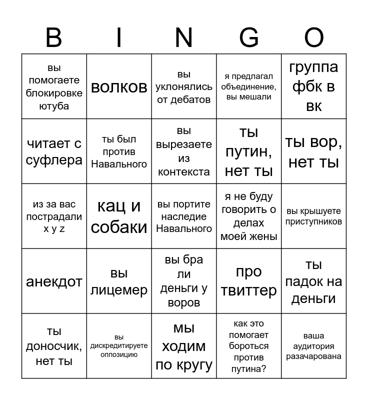This bingo card has a free space and 24 words: вы лицемер, вы дискредитируете оппозицию, вы вырезаете из контекста, ты доносчик, нет ты, группа фбк в вк, вы помогаете блокировке ютуба, читает с суфлера, волков, я не буду говорить о делах моей жены, вы брали деньги у воров, ты путин, нет ты, из за вас пострадали x y z, про твиттер, ты падок на деньги, ты был против Навального, как это помогает бороться против путина?, вы крышуете приступников, вы уклонялись от дебатов, ты вор, нет ты, кац и собаки, ваша аудитория разачарована, анекдот, я предлагал объединение, вы мешали and мы ходим по кругу.