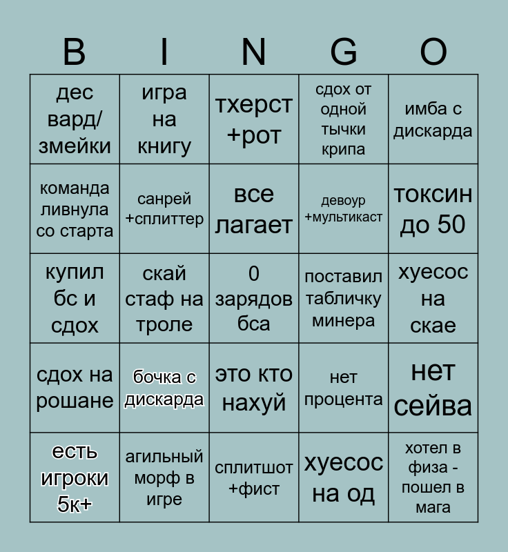 This bingo card has a free space and 24 words: бочка с дискарда, агильный морф в игре, все лагает, есть игроки 5к+, имба с дискарда, дес вард/змейки, команда ливнула со старта, игра на книгу, поставил табличку минера, это кто нахуй, девоур +мультикаст, купил бс и сдох, нет процента, нет сейва, санрей +сплиттер, хуесос на од, хуесос на скае, тхерст +рот, токсин до 50, скай стаф на троле, хотел в физа - пошел в мага, сдох на рошане, сдох от одной тычки крипа and сплитшот +фист.