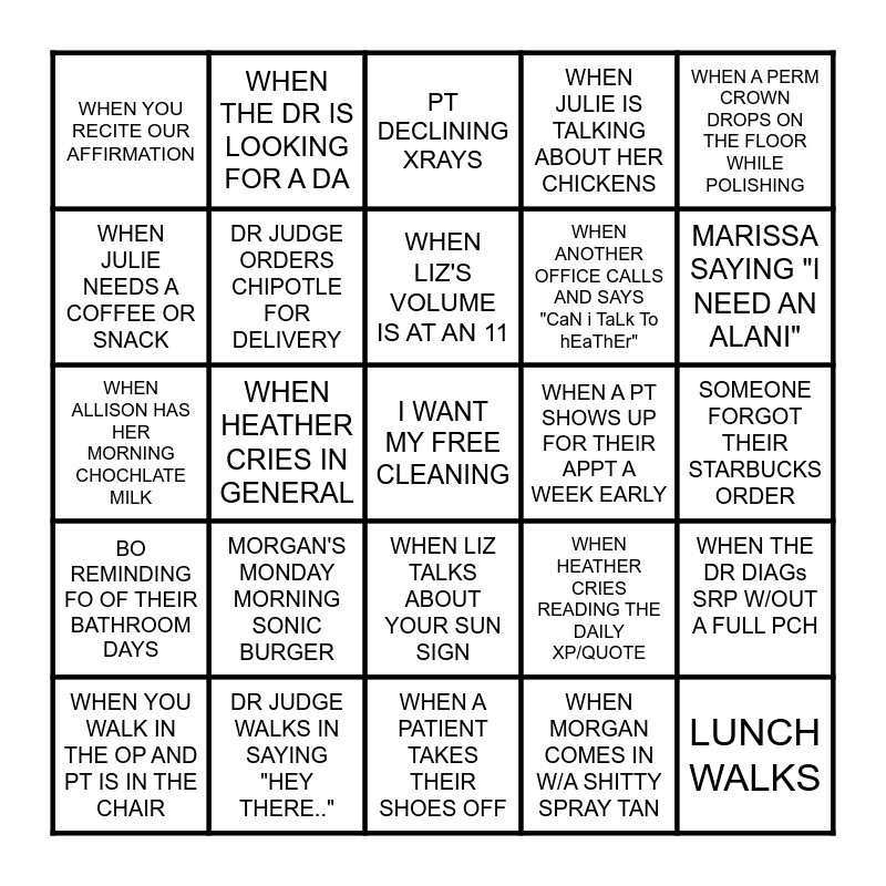 This bingo card has a free space and 24 words: MORGAN'S MONDAY MORNING SONIC BURGER, DR JUDGE WALKS IN SAYING "HEY THERE..", WHEN LIZ'S VOLUME IS AT AN 11, WHEN YOU WALK IN THE OP AND PT IS IN THE CHAIR, WHEN A PERM CROWN DROPS ON THE FLOOR WHILE POLISHING, WHEN YOU RECITE OUR AFFIRMATION, WHEN JULIE NEEDS A COFFEE OR SNACK, WHEN THE DR IS LOOKING FOR A DA, WHEN A PT SHOWS UP FOR THEIR APPT A WEEK EARLY, WHEN LIZ TALKS ABOUT YOUR SUN SIGN, WHEN ANOTHER OFFICE CALLS AND SAYS "CaN i TaLk To hEaThEr", WHEN ALLISON HAS HER MORNING CHOCHLATE MILK, WHEN HEATHER CRIES READING THE DAILY XP/QUOTE, WHEN THE DR DIAGs SRP W/OUT A FULL PCH, DR JUDGE ORDERS CHIPOTLE FOR DELIVERY, WHEN MORGAN COMES IN W/A SHITTY SPRAY TAN, SOMEONE FORGOT THEIR STARBUCKS ORDER, PT DECLINING XRAYS, MARISSA SAYING "I NEED AN ALANI", WHEN HEATHER CRIES IN GENERAL, LUNCH WALKS, BO REMINDING FO OF THEIR BATHROOM DAYS, WHEN JULIE IS TALKING ABOUT HER CHICKENS and WHEN A PATIENT TAKES THEIR SHOES OFF.