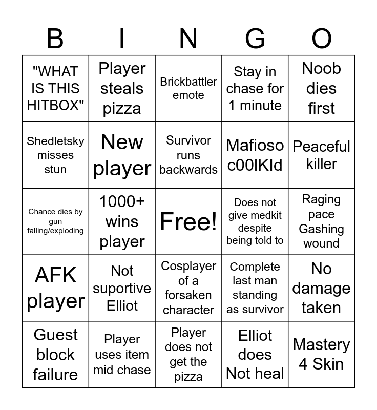 This bingo card has a free space and 24 words: Not suportive Elliot, Player uses item mid chase, Survivor runs backwards, Guest block failure, Noob dies first, ''WHAT IS THIS HITBOX'', Shedletsky misses stun, Player steals pizza, Does not give medkit despite being told to, Cosplayer of a forsaken character, Mafioso c00lKId, Chance dies by gun falling/exploding, Complete last man standing as survivor, No damage taken, New player, Elliot does Not heal, Raging pace Gashing wound, Brickbattler emote, Peaceful killer, 1000+ wins player, Mastery 4 Skin, AFK player, Stay in chase for 1 minute and Player does not get the pizza.