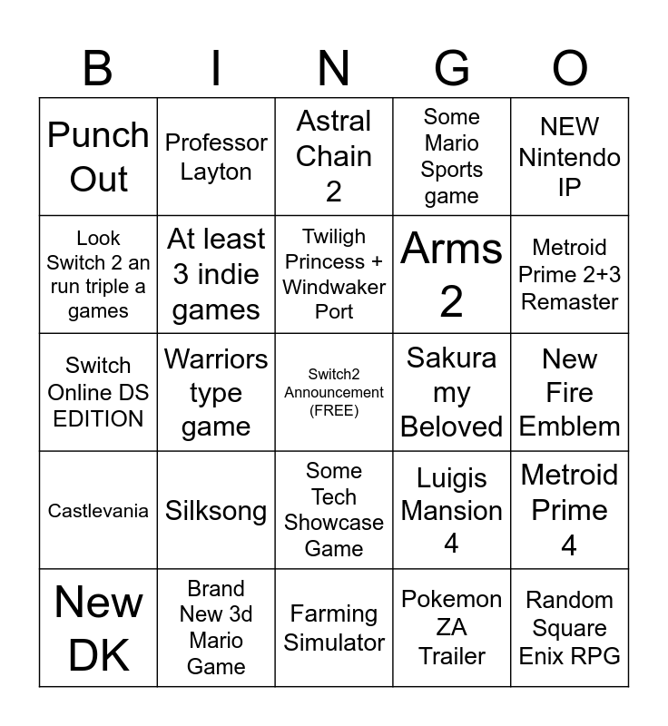 This bingo card has a free space and 24 words: Silksong, Brand New 3d Mario Game, Twiligh Princess + Windwaker Port, New DK, NEW Nintendo IP, Punch Out, Look Switch 2 an run triple a games, Professor Layton, Sakura my Beloved, Some Tech Showcase Game, Arms 2, Switch Online DS EDITION, Luigis Mansion 4, Metroid Prime 4, At least 3 indie games, Pokemon ZA Trailer, New Fire Emblem, Astral Chain 2, Metroid Prime 2+3 Remaster, Warriors type game, Random Square Enix RPG, Castlevania, Some Mario Sports game and Farming Simulator.