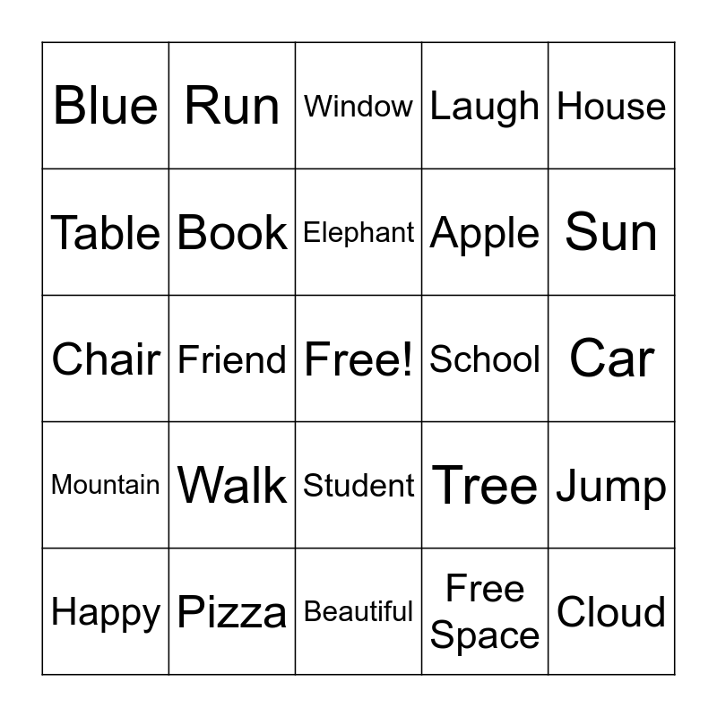 This bingo card has a free space and 25 words: Walk, Beautiful, Elephant, Happy, House, Blue, Table, Run, School, Student, Apple, Chair, Tree, Jump, Book, Dance, Car, Window, Sun, Friend, Cloud, Pizza, Mountain, Laugh and Free Space.