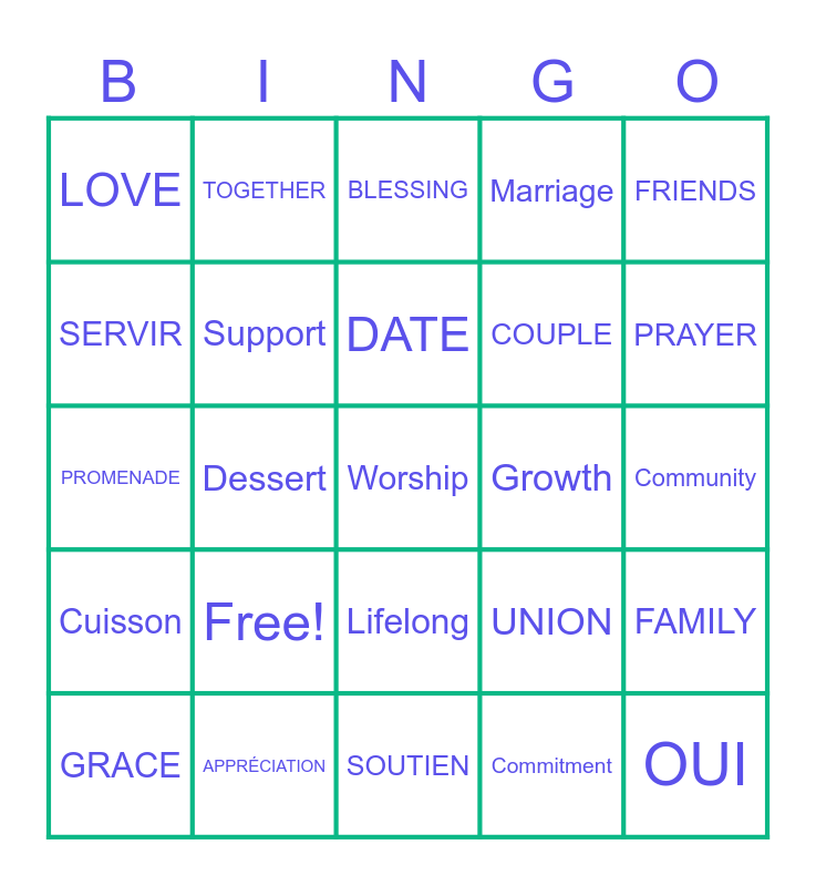 This bingo card has 25 words: Free!, SOUTIEN, DATE, GRACE, FRIENDS, LOVE, SERVIR, TOGETHER, Growth, Lifelong, COUPLE, PROMENADE, UNION, FAMILY, Support, OUI, Community, BLESSING, PRAYER, Dessert, Worship, APPRÉCIATION, Cuisson, Marriage and Commitment.