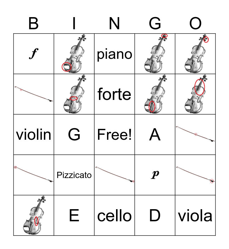 This bingo card has 14 images, a free space and 10 words: Pizzicato, E, forte, A, violin, D, piano, G, viola and cello.