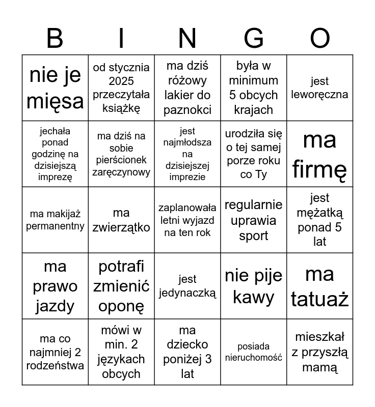 This bingo card has 25 words: potrafi zmienić oponę, ma dziecko poniżej 3 lat, jest najmłodsza na dzisiejszej imprezie, ma co najmniej 2 rodzeństwa, jest leworęczna, nie je mięsa, jechała ponad godzinę na dzisiejszą imprezę, od stycznia 2025 przeczytała książkę, regularnie uprawia sport, jest jedynaczką, urodziła się o tej samej porze roku co Ty, ma makijaż permanentny, nie pije kawy, ma tatuaż, ma dziś na sobie pierścionek zaręczynowy, mieszkał z przyszłą mamą, jest mężatką ponad 5 lat, ma dziś różowy lakier do paznokci, ma firmę, ma zwierzątko, zaplanowała letni wyjazd na ten rok, mówi w min. 2 językach obcych, ma prawo jazdy, była w minimum 5 obcych krajach and posiada nieruchomość.