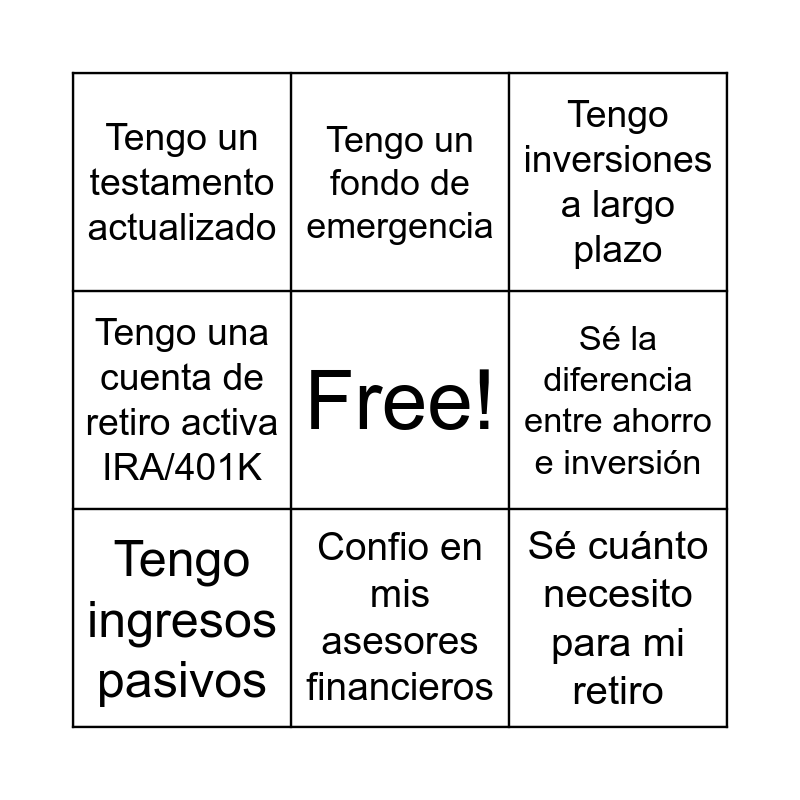 This bingo card has a free space and 20 words: Tengo un seguro de vida o incapacidad, Sé cuánto recibirá mi pareja en sus retiro, Tengo inversiones a largo plazo, He considerado los costos de salud en mi retiro, Tengo un plan de retiro, Sé cuánto necesito para mi retiro, He hablado con mi familia sobre mi retiro, Tengo un testamento actualizado, Tengo un hobby para cuando me retire, Tengo un fondo de emergencia, Sé cuál será mi fuente principal en mi retiro, He dicho "después lo veo" cuando me hablan de mi retiro, Sé la diferencia entre ahorro e inversión, Pago el balance de mis tarjetas de crédito cada mes, Tengo ingresos pasivos, Tengo un plan para asegurar el bienestar de mis hijos, Confio en mis asesores financieros, Tengo una cuenta de retiro activa IRA/401K, Tengo un plan para mantenerme activa en mi retiro and Sé cuánto gasto al mes.
