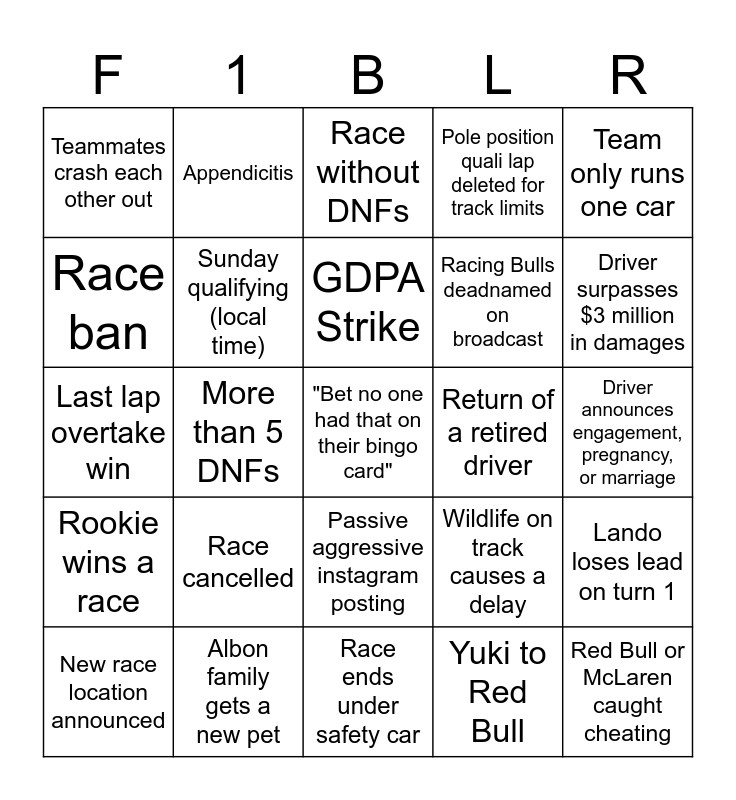 This bingo card has a free space and 24 words: Race cancelled, Albon family gets a new pet, GDPA Strike, New race location announced, Team only runs one car, Teammates crash each other out, Race ban, Appendicitis, Return of a retired driver, Passive aggressive instagram posting, Racing Bulls deadnamed on broadcast, Last lap overtake win, Wildlife on track causes a delay, Lando loses lead on turn 1, Sunday qualifying (local time), Yuki to Red Bull, Driver announces engagement, pregnancy, or marriage, Race without DNFs, Driver surpasses $3 million in damages, More than 5 DNFs, Red Bull or McLaren caught cheating, Rookie wins a race, Pole position quali lap deleted for track limits and Race ends under safety car.