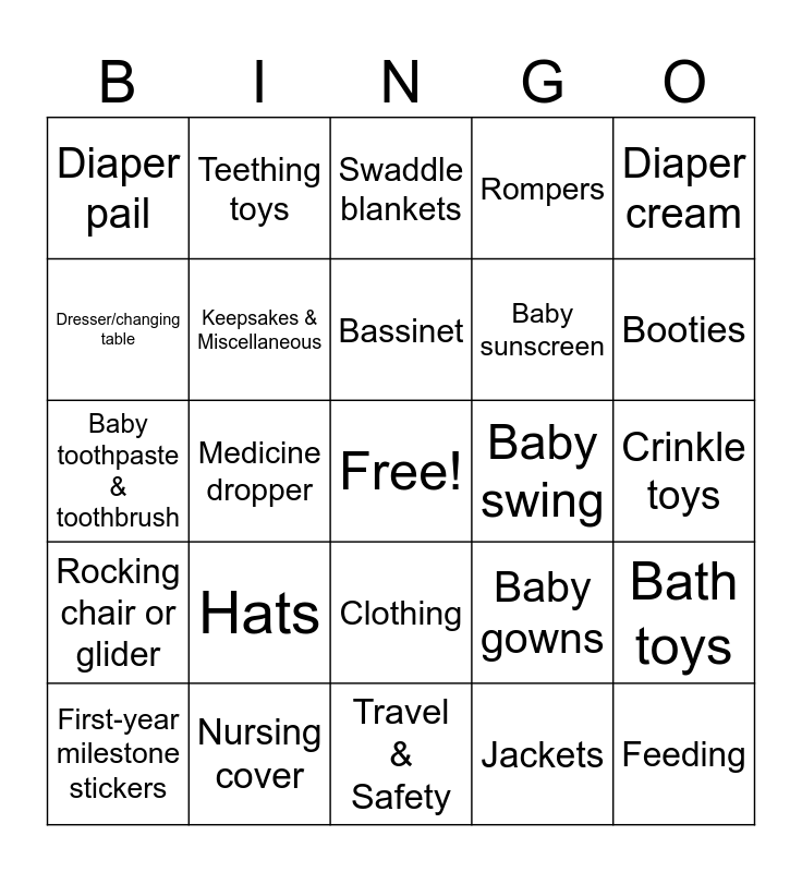 This bingo card has a free space and 106 words: Diapers (various sizes), Baby wipes, Diaper cream, Baby lotion, Baby shampoo & body wash, Baby powder, Pacifiers, Bottles, Bottle brush, Bottle drying rack, Formula (if needed), Burp cloths, Bibs, Washcloths, Hooded towels, Soft baby blankets, Swaddle blankets, Crib sheets, Changing pad, Changing pad covers, Clothing, Onesies (various sizes), Sleepers, Socks, Mittens (to prevent scratching), Hats, Booties, Rompers, Pants, Shirts, Baby gowns, Jackets, Seasonal outfits, Cute headbands/bows, Shoes (for later stages), Nursery Items, Crib, Crib mattress, Bassinet, Playpen or Pack ‘n Play, Sound machine, Baby monitor, Nightlight, Rocking chair or glider, Mobile for crib, Dresser/changing table, Closet dividers, Diaper pail, Hamper for baby laundry, Feeding, Nursing pillow, Nursing cover, Breast pump, Breast milk storage bags, High chair, Sippy cups, Baby food maker, Baby spoons, Baby bowls, Teething toys, Bibs with food catchers, Bathing & Grooming, Infant bathtub, Baby thermometer, Nail clippers, Brush & comb set, Nasal aspirator, Teething gel or rings, Baby sunscreen, Baby toothpaste & toothbrush, Medicine dropper, Travel & Safety, Infant car seat, Stroller, Diaper bag, Car seat cover, Baby carrier/sling, Portable changing mat, Stroller hooks, Window shades for the car, Travel-sized baby products, Baby proofing kit (outlet covers, cabinet locks), Baby gate, Playmat, Activity gym, Bouncer seat, Baby swing, Stuffed animals, Rattles, Soft books, Board books, Sensory toys, Musical toys, Stacking rings, Shape sorters, Bath toys, Tummy time mat, Learning cubes, Puppet toys, Crinkle toys, Keepsakes & Miscellaneous, Baby memory book, Personalized baby blanket, Handprint/footprint kit, First-year milestone stickers and Gift cards (for things parents may still need).