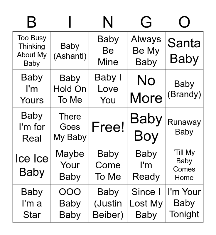 This bingo card has a free space and 24 words: Maybe Your Baby, OOO Baby Baby, Baby I Love You, Baby I'm a Star, Santa Baby, Too Busy Thinking About My Baby, Baby I'm Yours, Baby (Ashanti), Baby Boy, Baby Come To Me, No More, Baby I'm for Real, Baby I'm Ready, 'Till My Baby Comes Home, Baby Hold On To Me, Since I Lost My Baby, Runaway Baby, Baby Be Mine, Baby (Brandy), There Goes My Baby, I'm Your Baby Tonight, Ice Ice Baby, Always Be My Baby and Baby (Justin Beiber).