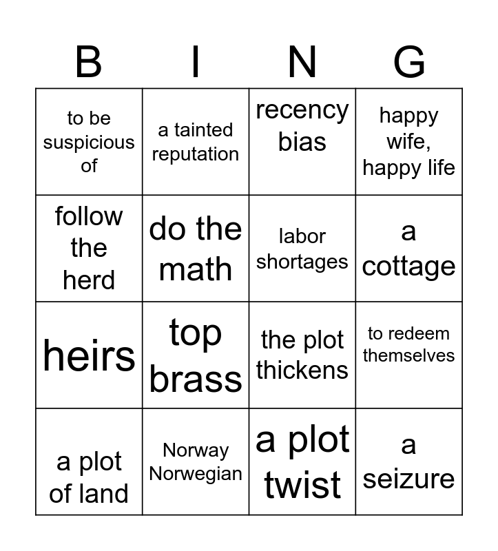 This bingo card has 16 words: Norway Norwegian, to redeem themselves, recency bias, to be suspicious of, heirs, a tainted reputation, the plot thickens, a plot twist, follow the herd, do the math, a plot of land, happy wife, happy life, top brass, a cottage, labor shortages and a seizure.