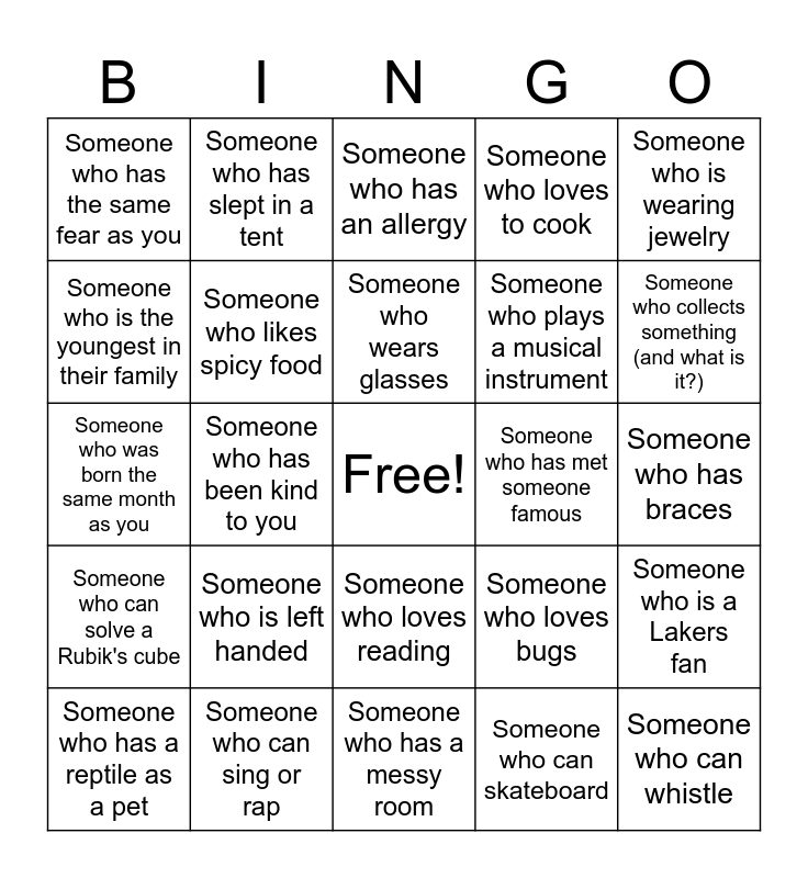 This bingo card has a free space and 24 words: Someone who is left handed, Someone who can sing or rap, Someone who wears glasses, Someone who has a reptile as a pet, Someone who is wearing jewelry, Someone who has the same fear as you, Someone who is the youngest in their family, Someone who has slept in a tent, Someone who has met someone famous, Someone who loves reading, Someone who plays a musical instrument, Someone who was born the same month as you, Someone who loves bugs, Someone who is a Lakers fan, Someone who likes spicy food, Someone who can skateboard, Someone who has braces, Someone who has an allergy, Someone who collects something (and what is it?), Someone who has been kind to you, Someone who can whistle, Someone who can solve a Rubik's cube, Someone who loves to cook and Someone who has a messy room.
