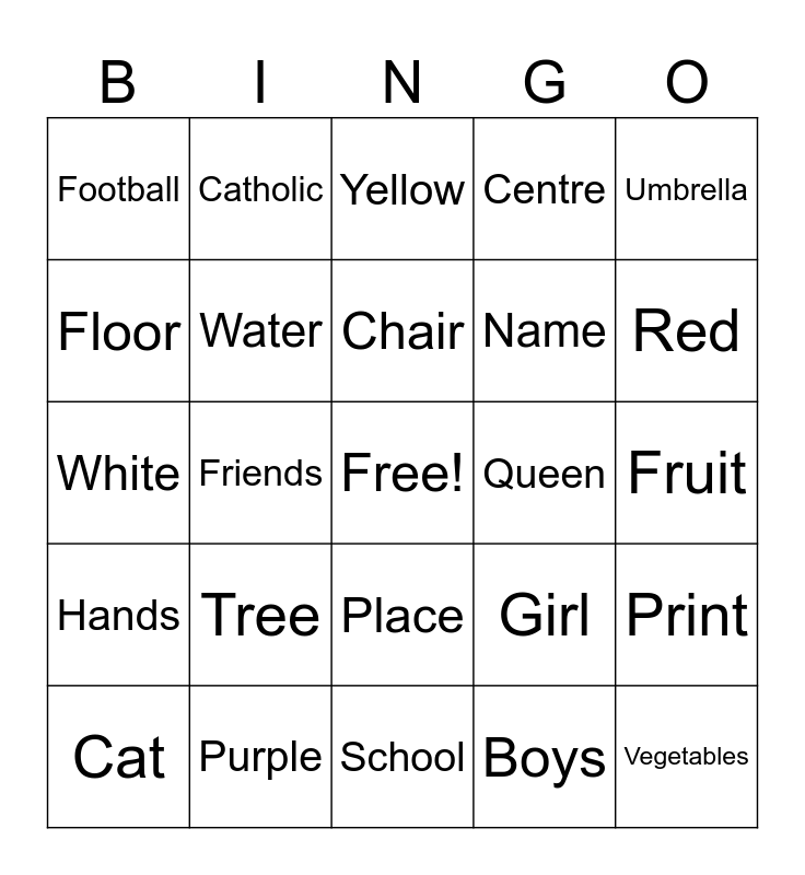 This bingo card has a free space and 29 words: Cat, Summer, Friends, Dinner, Football, Yellow, Water, Tree, Queen, Purple, Fruit, Vegetables, School, Boys, Red, Ball, Place, Hands, Umbrella, White, Girl, The, Name, Floor, Centre, Catholic, Print, Chair and Mouse.