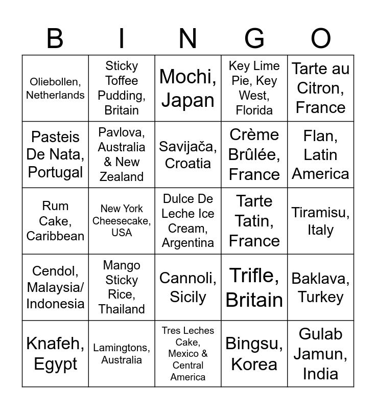 This bingo card has 25 words: Mango Sticky Rice, Thailand, Tres Leches Cake, Mexico & Central America, Savijača, Croatia, Knafeh, Egypt, Tarte au Citron, France, Oliebollen, Netherlands, Pasteis De Nata, Portugal, Sticky Toffee Pudding, Britain, Tarte Tatin, France, Cannoli, Sicily, Crème Brûlée, France, Rum Cake, Caribbean, Trifle, Britain, Baklava, Turkey, Pavlova, Australia & New Zealand, Gulab Jamun, India, Tiramisu, Italy, Mochi, Japan, Flan, Latin America, New York Cheesecake, USA, Dulce De Leche Ice Cream, Argentina, Lamingtons, Australia, Cendol, Malaysia/ Indonesia, Key Lime Pie, Key West, Florida and Bingsu, Korea.