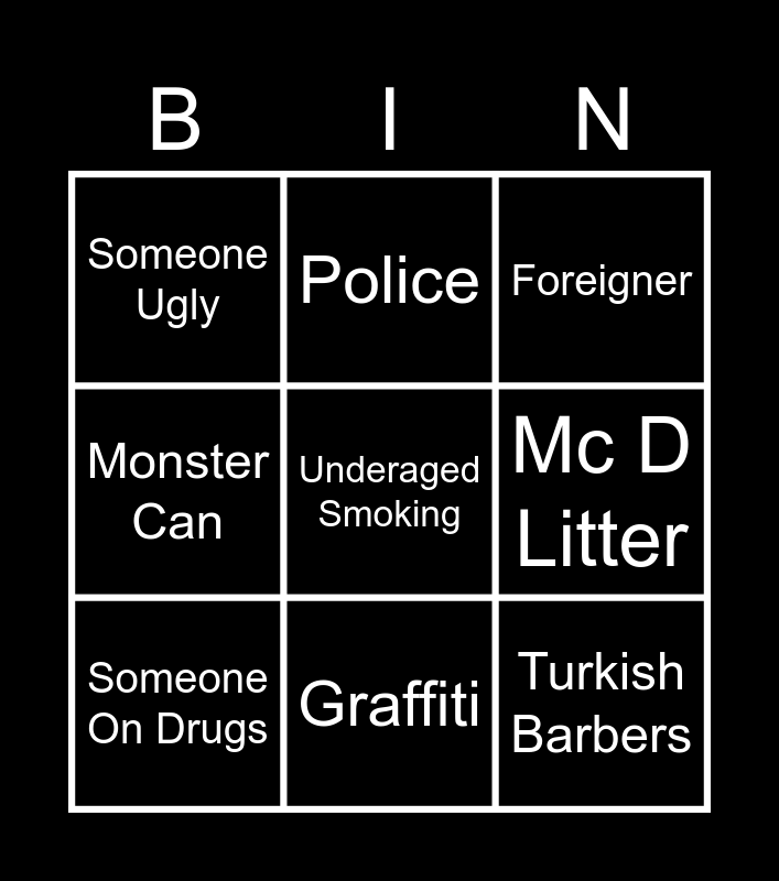 This bingo card has a free space and 8 words: Mc D Litter, Foreigner, Police, Someone On Drugs, Someone Ugly, Turkish Barbers, Monster Can and Graffiti.