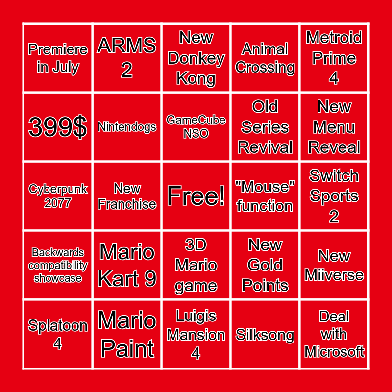 This bingo card has a free space and 24 words: Mario Kart 9, Mario Paint, GameCube NSO, Splatoon 4, Metroid Prime 4, Premiere in July, 399$, ARMS 2, "Mouse" function, 3D Mario game, Old Series Revival, Cyberpunk 2077, New Gold Points, New Miiverse, Nintendogs, Silksong, Switch Sports 2, New Donkey Kong, New Menu Reveal, New Franchise, Deal with Microsoft, Backwards compatibility showcase, Animal Crossing and Luigis Mansion 4.