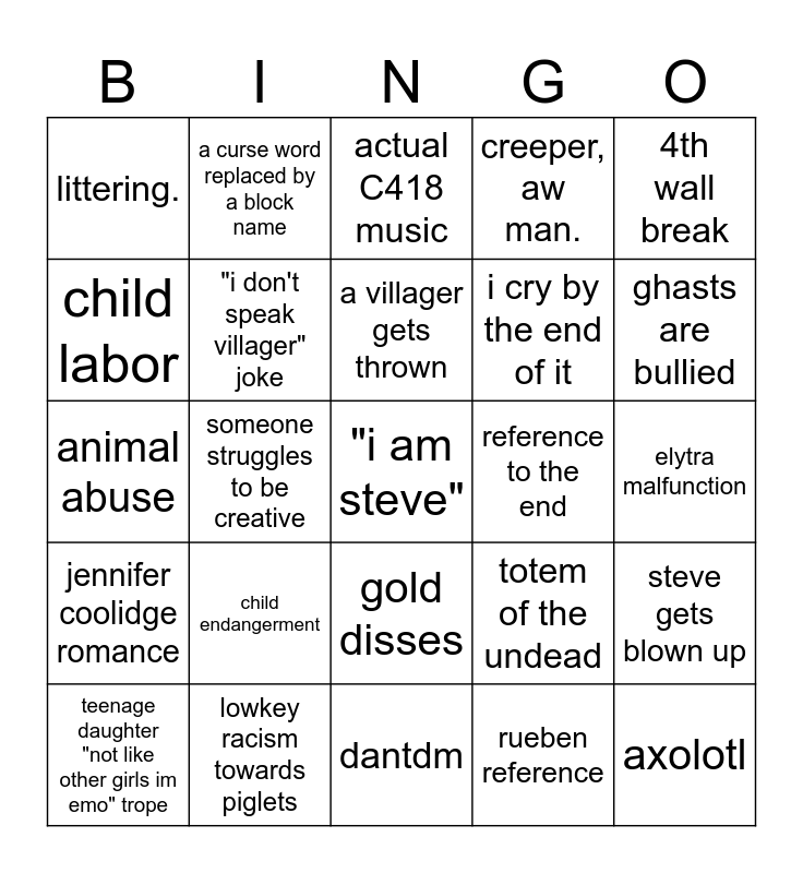 This bingo card has a free space and 24 words: child endangerment, lowkey racism towards piglets, a villager gets thrown, teenage daughter "not like other girls im emo" trope, 4th wall break, littering., child labor, a curse word replaced by a block name, reference to the end, gold disses, i cry by the end of it, animal abuse, totem of the undead, steve gets blown up, "i don't speak villager" joke, rueben reference, elytra malfunction, actual C418 music, ghasts are bullied, someone struggles to be creative, axolotl, jennifer coolidge romance, creeper, aw man. and dantdm.