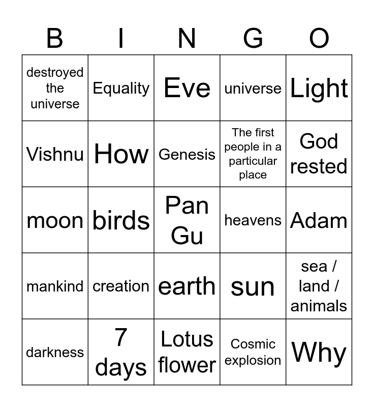 This bingo card has a free space and 24 words: creation, 7 days, Genesis, darkness, Light, destroyed the universe, Vishnu, Equality, heavens, earth, The first people in a particular place, moon, sun, sea / land / animals, How, Cosmic explosion, Adam, Eve, God rested, birds, Why, mankind, universe and Lotus flower.