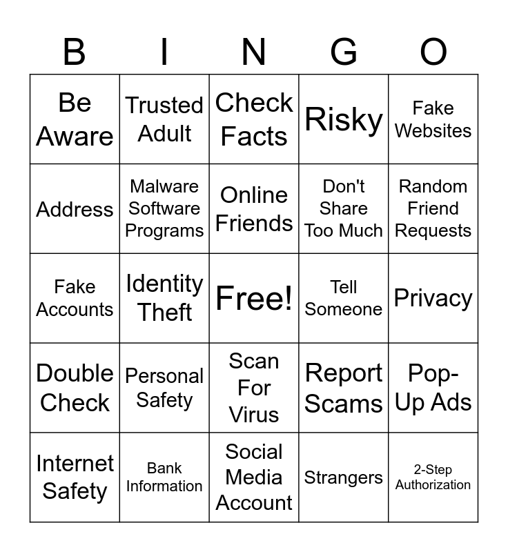 This bingo card has a free space and 29 words: Internet Safety, Strong Passwords, Identity Theft, Downloads, Be Aware, Check Facts, Malware Software Programs, Personal Safety, Tell Someone, Bank Information, Privacy, 2-Step Authorization, Social Media Account, Strangers, Random Friend Requests, Red Flags, Scan For Virus, Double Check, Fake Websites, Fake Accounts, Report Scams, Fake Profiles, Don't Share Too Much, Address, Risky, Trusted Adult, Pop-Up Ads, Online Friends and Don't Overshare.