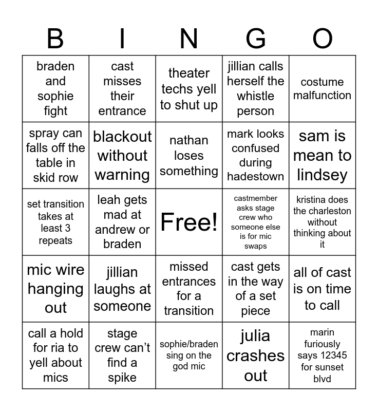 This bingo card has a free space and 24 words: jillian laughs at someone, stage crew can’t find a spike, nathan loses something, call a hold for ria to yell about mics, costume malfunction, braden and sophie fight, spray can falls off the table in skid row, cast misses their entrance, castmember asks stage crew who someone else is for mic swaps, missed entrances for a transition, mark looks confused during hadestown, set transition takes at least 3 repeats, cast gets in the way of a set piece, all of cast is on time to call, blackout without warning, julia crashes out, kristina does the charleston without thinking about it, theater techs yell to shut up, sam is mean to lindsey, leah gets mad at andrew or braden, marin furiously says 12345 for sunset blvd, mic wire hanging out, jillian calls herself the whistle person and sophie/braden sing on the god mic.