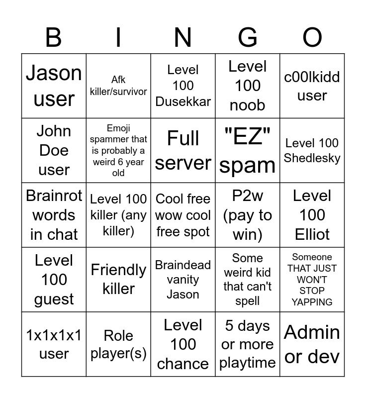 This bingo card has a free space and 24 words: Friendly killer, Role player(s), Full server, 1x1x1x1 user, c00lkidd user, Jason user, John Doe user, Afk killer/survivor, P2w (pay to win), Braindead vanity Jason, "EZ" spam, Brainrot words in chat, Some weird kid that can't spell, Someone THAT JUST WON'T STOP YAPPING, Emoji spammer that is probably a weird 6 year old, 5 days or more playtime, Level 100 Elliot, Level 100 Dusekkar, Level 100 Shedlesky, Level 100 killer (any killer), Admin or dev, Level 100 guest, Level 100 noob and Level 100 chance.