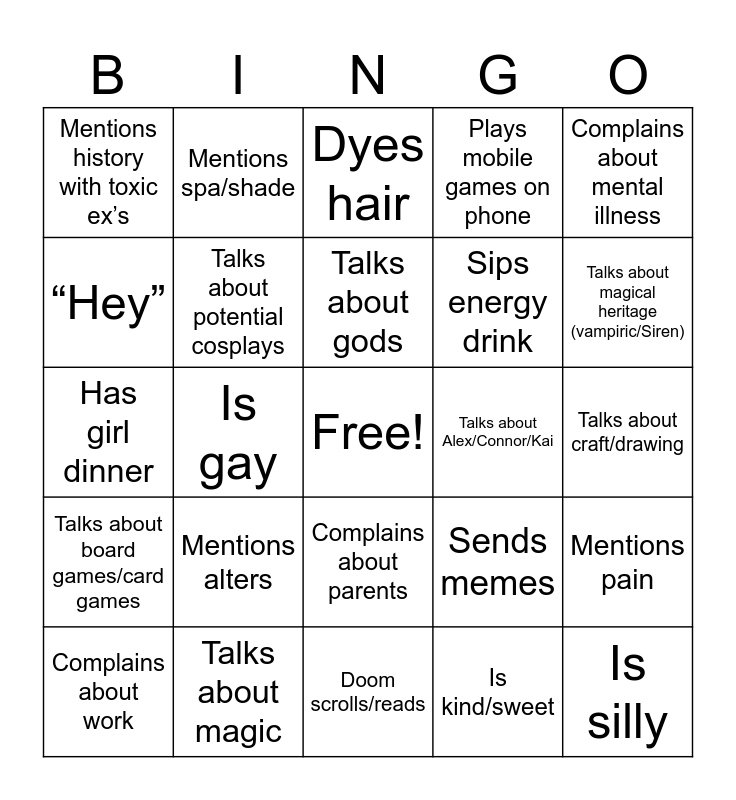 This bingo card has a free space and 24 words: Mentions alters, Talks about magic, Talks about gods, Complains about work, Complains about mental illness, Mentions history with toxic ex’s, “Hey”, Mentions spa/shade, Talks about Alex/Connor/Kai, Complains about parents, Sips energy drink, Has girl dinner, Sends memes, Mentions pain, Talks about potential cosplays, Is kind/sweet, Talks about craft/drawing, Dyes hair, Talks about magical heritage (vampiric/Siren), Is gay, Is silly, Talks about board games/card games, Plays mobile games on phone and Doom scrolls/reads.