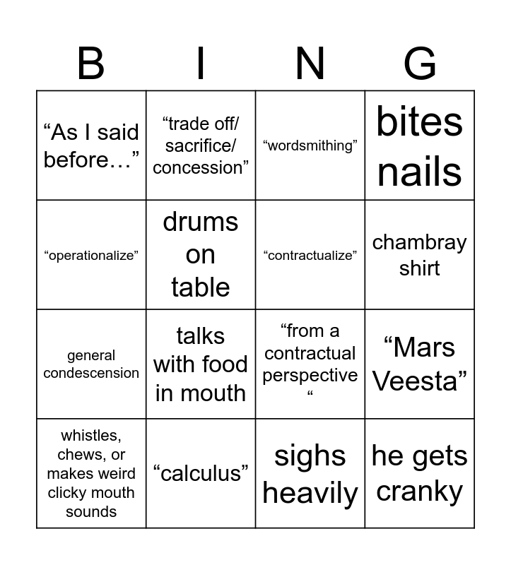 This bingo card has 16 words: “calculus”, “Mars Veesta”, “wordsmithing”, “As I said before…”, general condescension, “trade off/ sacrifice/ concession”, “from a contractual perspective “, sighs heavily, “operationalize”, drums on table, whistles, chews, or makes weird clicky mouth sounds, bites nails, talks with food in mouth, chambray shirt, “contractualize” and he gets cranky.