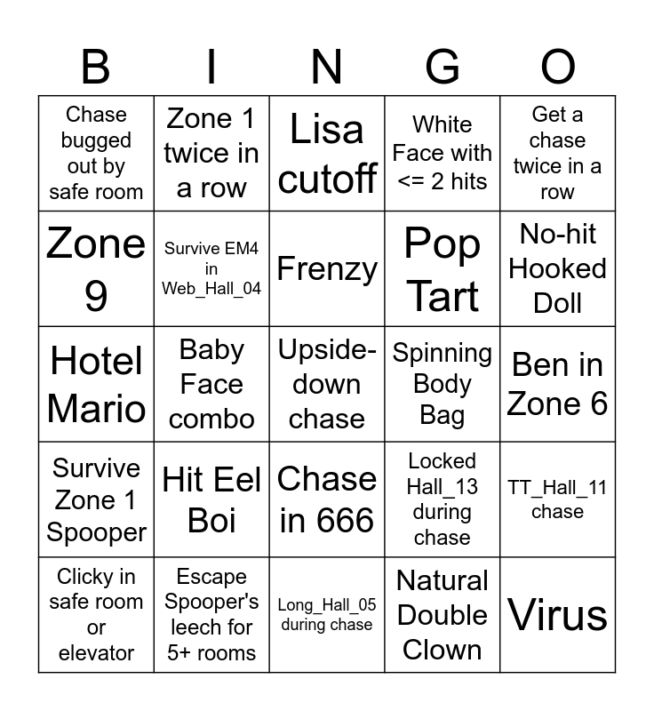 This bingo card has a free space and 24 words: Hit Eel Boi, Escape Spooper's leech for 5+ rooms, Frenzy, Clicky in safe room or elevator, Get a chase twice in a row, Chase bugged out by safe room, Zone 9, Zone 1 twice in a row, Spinning Body Bag, Chase in 666, Pop Tart, Hotel Mario, Locked Hall_13 during chase, TT_Hall_11 chase, Survive EM4 in Web_Hall_04, Natural Double Clown, Ben in Zone 6, Lisa cutoff, No-hit Hooked Doll, Baby Face combo, Virus, Survive Zone 1 Spooper, White Face with <= 2 hits and Long_Hall_05 during chase.