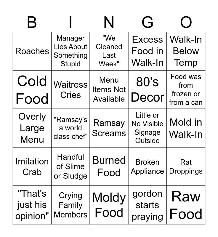 This bingo card has a free space and 25 words: Handful of Slime or Sludge, Moldy Food, Menu Items Not Available, "That's just his opinion", Walk-In Below Temp, Roaches, Cold Food, Manager Lies About Something Stupid, Little or No Visible Signage Outside, Burned Food, 80's Decor, Overly Large Menu, Broken Appliance, Rat Droppings, Waitress Cries, Broken Tables/ Chairs, Mold in Walk-In, "We Cleaned Last Week", Food was from frozen or from a can, "Ramsay's a world class chef", Raw Food, Crying Family Members, Imitation Crab, Excess Food in Walk-In and gordon starts praying.