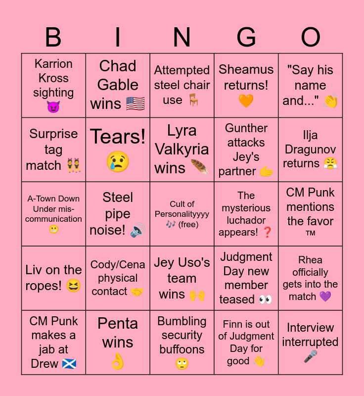 This bingo card has a free space and 24 words: Cody/Cena physical contact π€, Penta wins π, Lyra Valkyria wins πͺΆ, CM Punk makes a jab at Drew π΄σ §σ ’σ ³σ £σ ΄σ Ώ, "Say his name and..." π, Karrion Kross sighting π, Surprise tag match π―, Chad Gable wins πΊπΈ, The mysterious luchador appears! β, Jey Uso's team wins π, Gunther attacks Jey's partner π«±, A-Town Down Under mis-communication π¬, Judgment Day new member teased π, Rhea officially gets into the match π, Tears! π’, Finn is out of Judgment Day for good π, CM Punk mentions the favor β’οΈ, Attempted steel chair use πͺ, Ilja Dragunov returns π€, Steel pipe noise! π, Interview interrupted π€, Liv on the ropes! π, Sheamus returns! π§‘ and Bumbling security buffoons π.