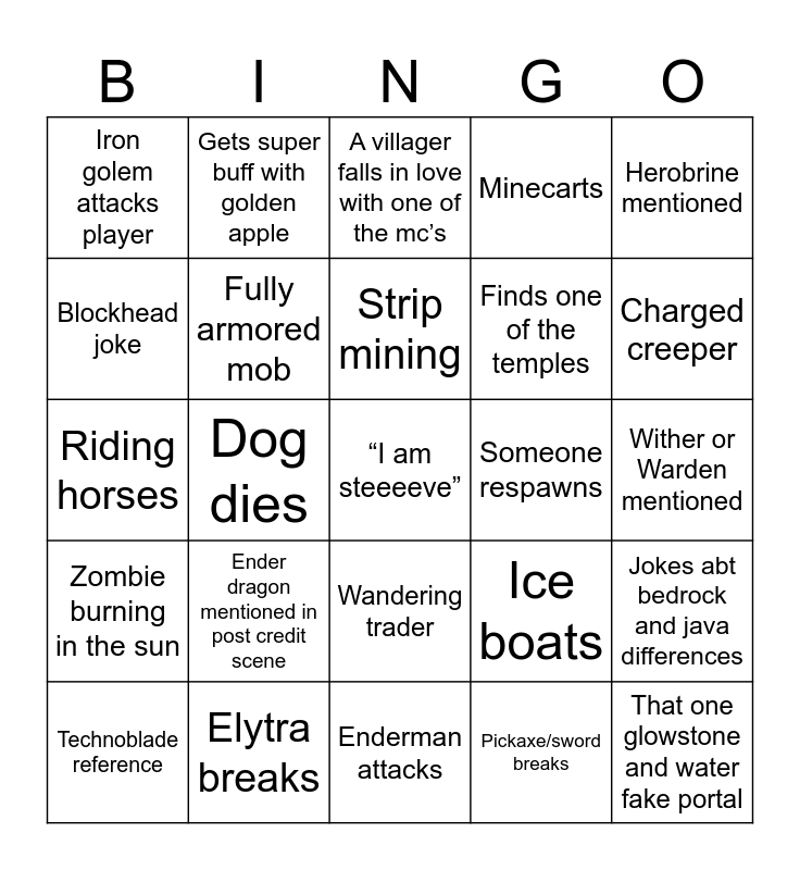 This bingo card has a free space and 24 words: Ender dragon mentioned in post credit scene, Elytra breaks, Strip mining, Technoblade reference, Herobrine mentioned, Iron golem attacks player, Blockhead joke, Gets super buff with golden apple, Someone respawns, Wandering trader, Finds one of the temples, Riding horses, Ice boats, Jokes abt bedrock and java differences, Fully armored mob, Pickaxe/sword breaks, Wither or Warden mentioned, A villager falls in love with one of the mc’s, Charged creeper, Dog dies, That one glowstone and water fake portal, Zombie burning in the sun, Minecarts and Enderman attacks.