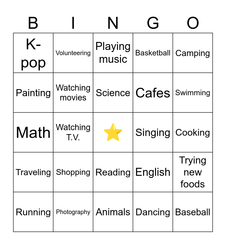 This bingo card has a free space and 24 words: Shopping, Photography, Science, Running, Camping, K-pop, Painting, Volunteering, Singing, Reading, Cafes, Math, English, Trying new foods, Watching movies, Dancing, Cooking, Playing music, Swimming, Watching T.V., Baseball, Traveling, Basketball and Animals.