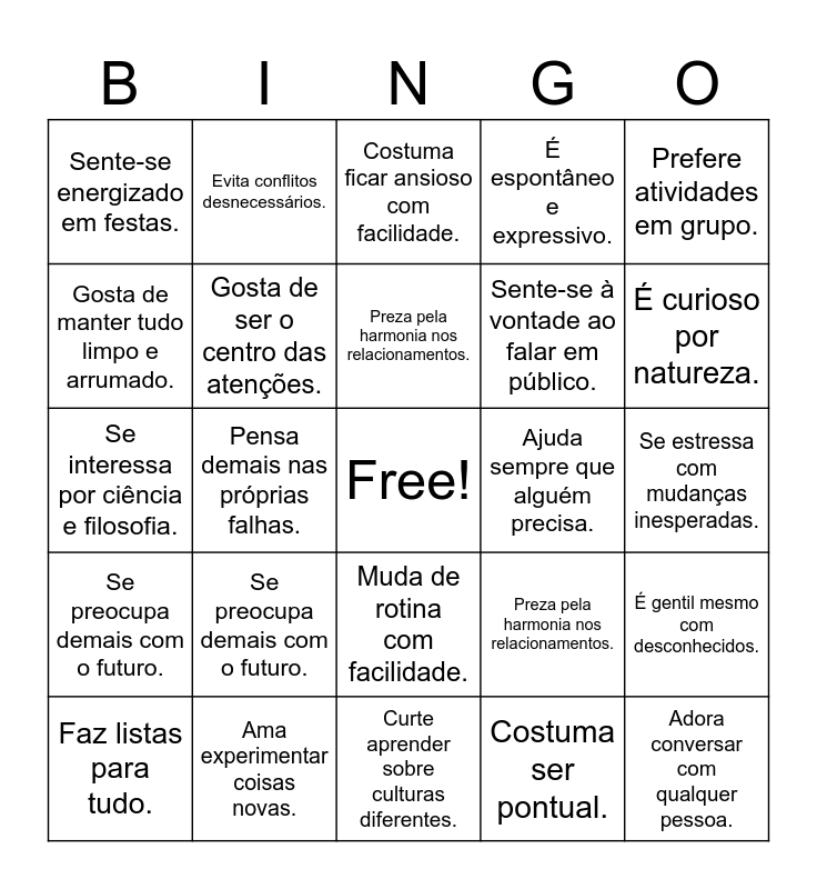 This bingo card has a free space and 62 words: É curioso por natureza., Ama experimentar coisas novas., É sensível a críticas., Se preocupa demais com o futuro., Tem dificuldade para relaxar., Faz amizade com facilidade., Gosta de ser o centro das atenções., Organiza suas tarefas com antecedência., Sente-se à vontade ao falar em público., Gosta de ver os outros felizes., É espontâneo e expressivo., Gosta de arte e literatura., Gosta de manter tudo limpo e arrumado., Gosta de metas claras e planejamentos., Gosta de aventuras e desafios sociais., Sente-se energizado em festas., Adora conversar com qualquer pessoa., Prefere atividades em grupo., Muda de rotina com facilidade., Preza pela harmonia nos relacionamentos., Ajuda sempre que alguém precisa., Costuma ficar ansioso com facilidade., Faz listas para tudo., Costuma ser pontual., Pensa demais nas próprias falhas., Tem ideias criativas e fora do comum., É solidário e cooperativo., Explora novos caminhos com entusiasmo., É gentil mesmo com desconhecidos., Segue prazos rigorosamente., Fica muito nervoso antes de provas., Tem disciplina para estudar sozinho., Tem oscilações de humor frequentes., Curte aprender sobre culturas diferentes., Se estressa com mudanças inesperadas., Evita conflitos desnecessários., Preza por eficiência e responsabilidade., Respeita as opiniões alheias., Pensa demais nas próprias falhas., Ajuda sempre que alguém precisa., Se interessa por ciência e filosofia., É solidário e cooperativo., Se preocupa demais com o futuro., Se estressa com mudanças inesperadas., É curioso por natureza., Preza pela harmonia nos relacionamentos., Tem ideias criativas e fora do comum., Gosta de ver os outros felizes., Respeita as opiniões alheias., Gosta de ser o centro das atenções., Muda de rotina com facilidade., Curte aprender sobre culturas diferentes., Faz amizade com facilidade., Organiza suas tarefas com antecedência., Sente-se à vontade ao falar em público., Adora conversar com qualquer pessoa., Gosta de metas claras e planejamentos., Ama experimentar coisas novas., Evita conflitos desnecessários., Explora novos caminhos com entusiasmo., Costuma ficar ansioso com facilidade. and É empático e compreensivo..
