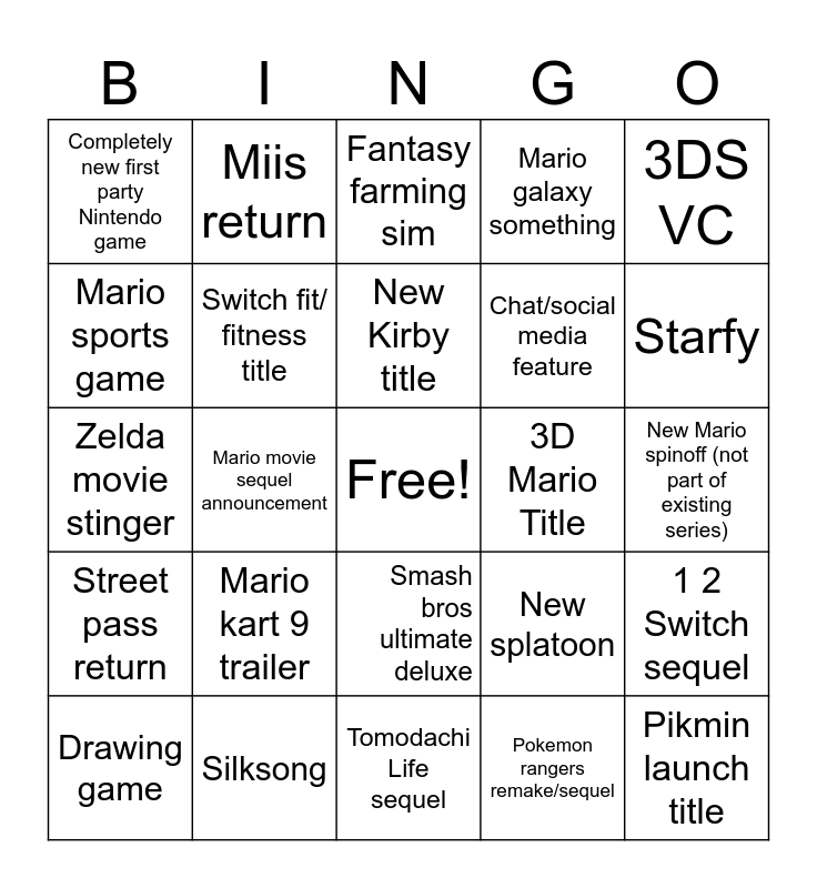 This bingo card has a free space and 24 words: Mario kart 9 trailer, Silksong, New Kirby title, Drawing game, 3DS VC, Completely new first party Nintendo game, Mario sports game, Miis return, 3D Mario Title, Smash bros ultimate deluxe, Chat/social media feature, Zelda movie stinger, New splatoon, 1 2 Switch sequel, Switch fit/ fitness title, Pokemon rangers remake/sequel, New Mario spinoff (not part of existing series), Fantasy farming sim, Starfy, Mario movie sequel announcement, Pikmin launch title, Street pass return, Mario galaxy something and Tomodachi Life sequel.
