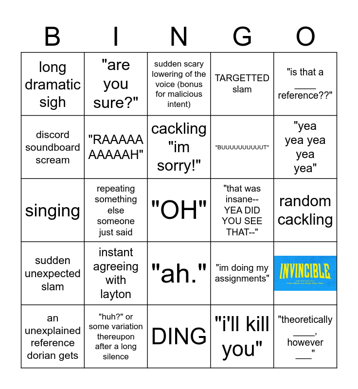 This bingo card has 1 images, a free space and 25 words: "ah.", "i'll kill you", cackling "im sorry!", "huh?" or some variation thereupon after a long silence, "is that a ____ reference??", long dramatic sigh, discord soundboard scream, "are you sure?", random cackling, "im doing my assignments", "BUUUUUUUUUUT", singing, an unexplained reference dorian gets, repeating something else someone just said, "you do that a lot", TARGETTED slam, sudden unexpected slam, sudden scary lowering of the voice (bonus for malicious intent), "theoretically ____, however ___", "yea yea yea yea yea", DING, "that was insane-- YEA DID YOU SEE THAT--", instant agreeing with layton, "RAAAAA AAAAAH" and "technically-".