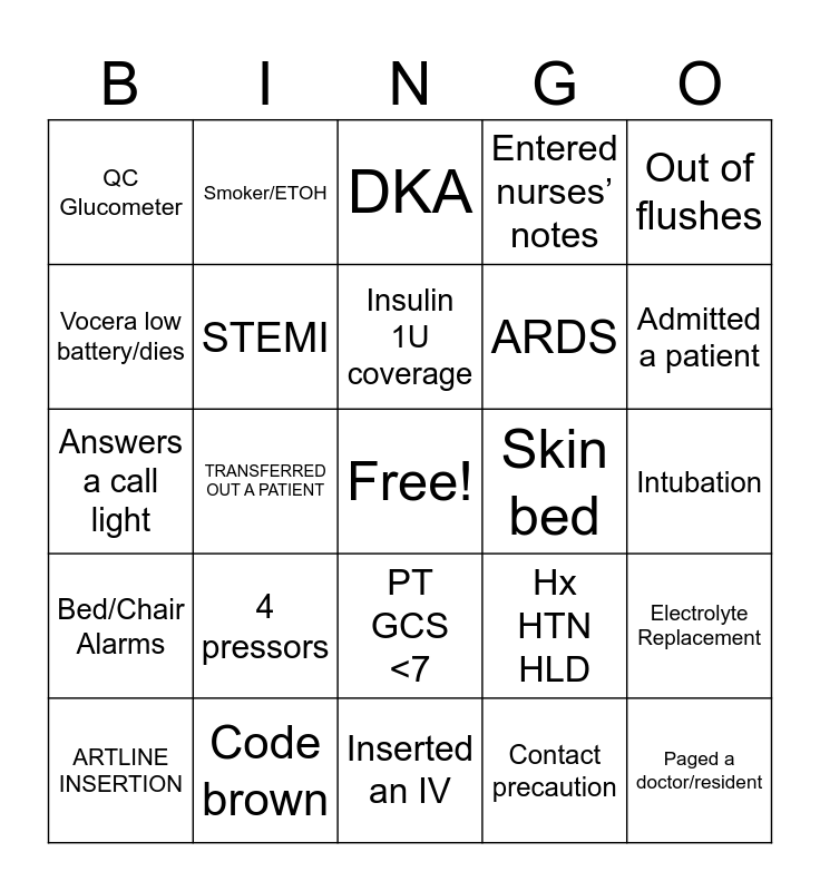 This bingo card has a free space and 29 words: ARTLINE INSERTION, GRABBED A CUP OF ICE, TRANSFERRED OUT A PATIENT, RRT/CODE BLUE, QC Glucometer, DKA, STEMI, 4 pressors, Skin bed, Code brown, Intubation, Paged a doctor/resident, Inserted an IV, Contact precaution, Admitted a patient, Talked to family, PT GCS <7, Bed/Chair Alarms, Out of flushes, Answers a call light, Hx HTN HLD, Calls RT, ARDS, Vocera low battery/dies, Entered nurses’ notes, Smoker/ETOH, Electrolyte Replacement, Insulin 1U coverage and Talked to lab/Pharmacist.
