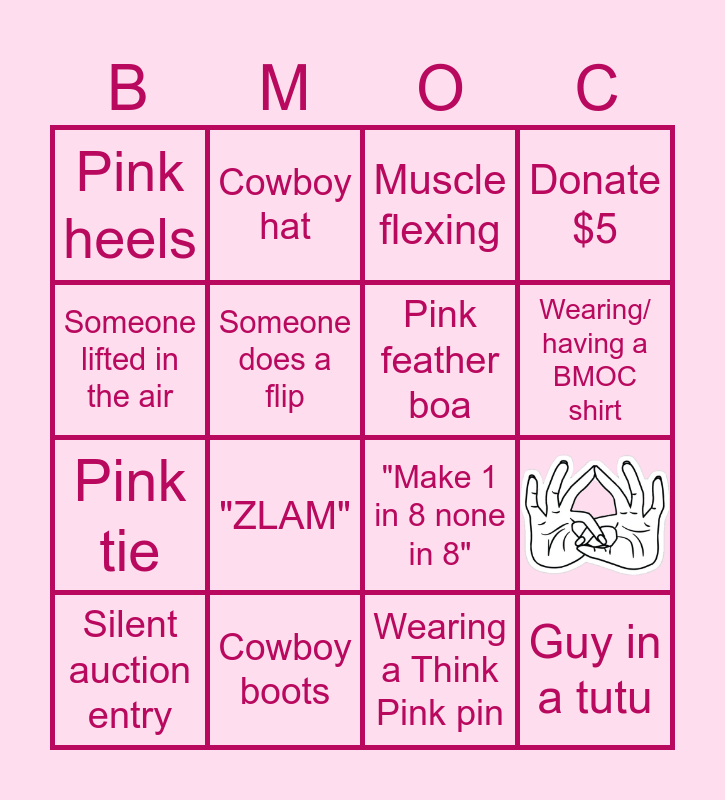 This bingo card has 1 images and 18 words: "Make 1 in 8 none in 8", "Think Pink", Muscle flexing, Guy in a tutu, Someone lifted in the air, Wearing a Think Pink pin, Pink heels, Cowboy hat, Pink tie, "ZLAM", Someone does a flip, Pink feather boa, Cowboy boots, Silent auction entry, "Yeehaw", Donate $5, Wearing/ having a BMOC shirt and Donate $10.