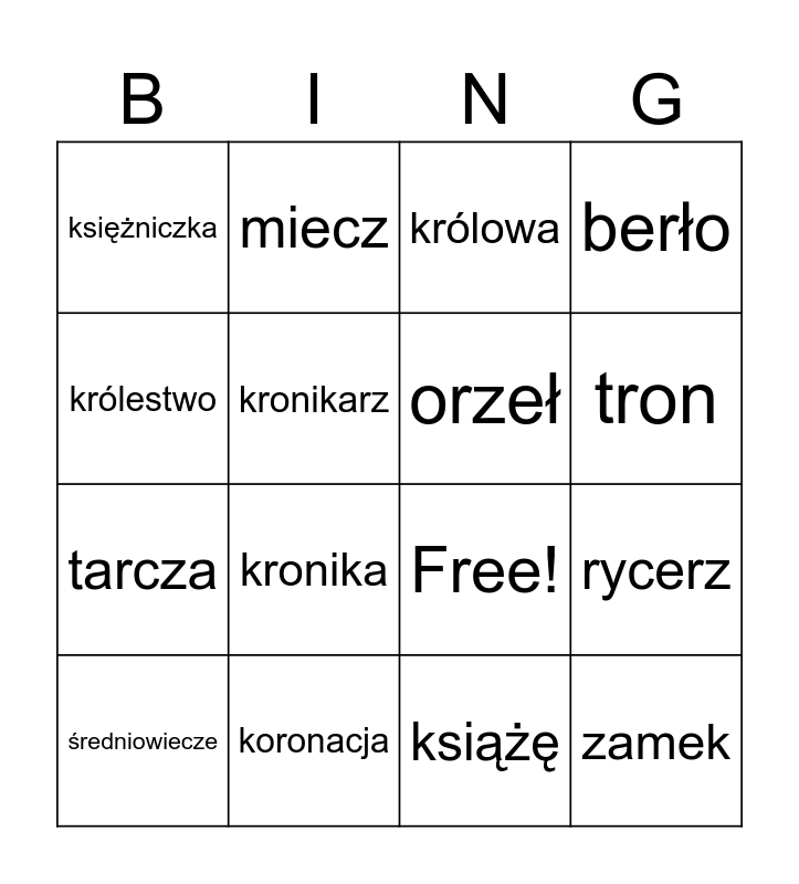 This bingo card has 19 words: Free!, król, królowa, zamek, rycerz, królestwo, książę, księżniczka, miecz, tarcza, kronika, kronikarz, orzeł, koronacja, średniowiecze, komnata, berło, tron and skarb.
