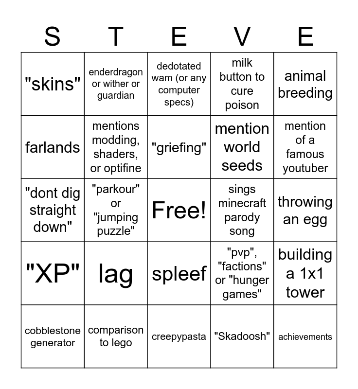 This bingo card has a free space and 34 words: Mention of Minecraft "Alpha" or "Beta", "Skadoosh", something about Endermen hating water, Herobrine, "XP", mentions modding, shaders, or optifine, animal breeding, cobblestone generator, enderdragon or wither or guardian, "mojang" or any mojang employee, "griefing", dedotated wam (or any computer specs), "realms" or "multiplayer", beds in the nether, sings minecraft parody song, mention of a famous youtuber, comparison to lego, "dont dig straight down", lag, "pvp", "factions" or "hunger games", spleef, million iq redstone contraption, "skins", throwing an egg, creepypasta, achievements, milk button to cure poison, curing a zombie villager, mention world seeds, farlands, "cave sounds", "parkour" or "jumping puzzle", building a 1x1 tower and rainbow sheep/dinnerbone trick.
