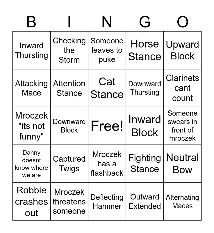 This bingo card has a free space and 48 words: Delayed Sword, Alternating Maces, Sword of Destruction, Deflecting Hammer, Captured Twigs, Grasp of Death, Checking the Storm, Mace of Aggression, Attacking Mace, Sword and Hammer, Attention Stance, Horse Stance, Neutral Bow, Fighting Stance, Meditation Stance, Forward Bow, Cat Stance, Inward Block, Outward Block, Upward Block, Downward Block, Outward Extended, Inward Thursting, Downward Thursting, Flutes cant play in tune, Clarinets cant count, Robbie crashes out, Mroczek crashes out, Mroczek has a flashback, Danny doesnt know where we are, Robbie screams something stupid when mroczek says something, Somebody falls, Stand knocks over, Patrick leaves early, Mroczek threatens someone, Joey drinks a red bull, Mroczek talks about bald, Someone swears in front of mroczek, Someone spills something and mroczek crashes out, Someone drops instrument/mute, Someone gets caught with phone, Andrew cant play, Someone leaves to puke, Mroczek uses a gen z term, Mroczek "its not funny", Scale playing assignment, Mroczek says something about austins grades and We get on a first name basis with chrisopher.