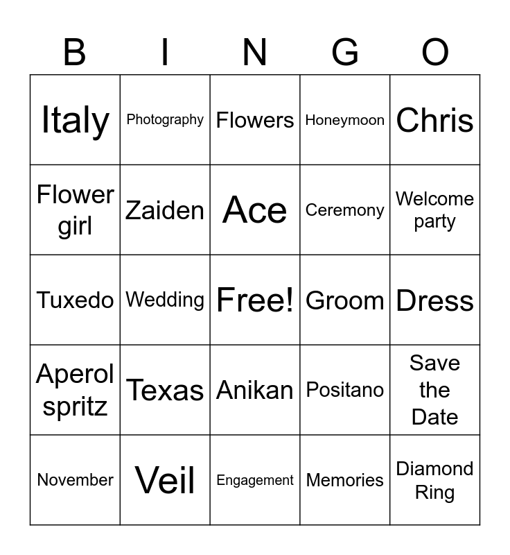 This bingo card has a free space and 39 words: Bridesmaid, Bride, Marfa, Zaiden, November, Anikan, Ace, Brooke, Chris, Aperol spritz, Wedding, Honeymoon, Diamond Ring, Dress, Groom, Texas, Wedding cake, Italy, Almfia coast, Positano, Flower girl, Engagement, Ceremony, Welcome party, Bridal shower, Love, Just Married, Romance, Groomsmen, Photography, Dance, Music, Flowers, Veil, Memories, Vows, Save the Date, Tuxedo and Cheers.