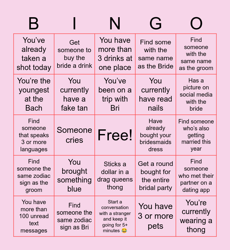 This bingo card has a free space and 24 words: You brought something blue, Find someone the same zodiac sign as Bri, You’ve been on a trip with Bri, You have more than 100 unread text messages, Find someone with the same name as the groom, You’ve already taken a shot today, You’re the youngest at the Bach, Get someone to buy the bride a drink, Have already bought your bridesmaids dress, Sticks a dollar in a drag queens thong, You currently have read nails, Find someone that speaks 3 or more languages, Get a round bought for the entire bridal party, Find someone who met their partner on a dating app, You currently have a fake tan, You have 3 or more pets, Find someone who’s also getting married this year, You have more than 3 drinks at one place, Has a picture on social media with the bride, Someone cries, You’re currently wearing a thong, Find someone the same zodiac sign as the groom, Find some with the same name as the Bride and Start a conversation with a stranger and keep it going for 5+ minutes 😂.