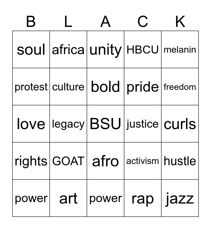 This bingo card has a free space and 24 words: power, GOAT, bold, rap, melanin, soul, africa, unity, justice, curls, love, culture, activism, hustle, protest, art, power, HBCU, freedom, rights, legacy, afro, pride and jazz.