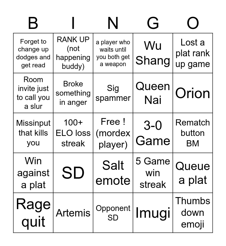 This bingo card has a free space and 24 words: SD, Artemis, Sig spammer, Rage quit, Lost a plat rank up game, Forget to change up dodges and get read, Room invite just to call you a slur, RANK UP (not happening buddy), 3-0 Game, Salt emote, Queen Nai, Missinput that kills you, 5 Game win streak, Queue a plat, Broke something in anger, Imugi, Rematch button BM, a player who waits until you both get a weapon, Orion, 100+ ELO loss streak, Thumbs down emoji, Win against a plat, Wu Shang and Opponent SD.