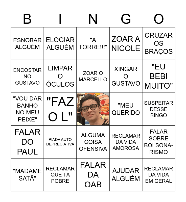This bingo card has a free space and 28 words: FALAR SOBRE BOLSONA-RISMO, "EU GANHO POUCO MAS ME DIVIRTO", XINGAR O GUSTAVO, AJUDAR ALGUÉM, ENCOSTAR NO GUSTAVO, "A TORRE!!!", ELOGIAR ALGUÉM, FALAR DO PAUL, "MEU QUERIDO, "MADAME SATÃ", "VOU DAR BANHO NO MEU PEIXE", ZOAR A NICOLE, RECLAMAR QUE TÁ POBRE, FALAR DA OAB, "EU BEBI MUITO", DISCURSO ANTI-CAPITALISTA, PIADA AUTO DEPRECIATIVA, LIMPAR O ÓCULOS, ZOAR O MARCELLO, ALGUMA COISA OFENSIVA, ESNOBAR ALGUÉM, DISCURSO MAIOR QUE 10 SEGUNDOS, RECLAMAR DA VIDA EM GERAL, "FAZ O L", SUSPEITAR DESSE BINGO, RECLAMAR DA VIDA AMOROSA, CRUZAR OS BRAÇOS and OLHAR A HORA NO RELÓGIO.